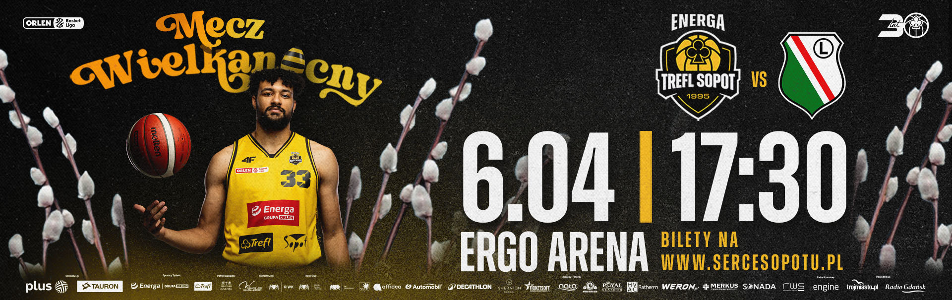 Mecz Wielkanocny w ERGO ARENIE! W poniedziałek 6 kwietnia o 17:30 drużyna Energi Trefla Sopot podejmie na własnym parkiecie Legię Warszawa. W tym sezonie z aktualnym mistrzem Polski mierzyliśmy się już trzykrotnie i za każdym razem górą byli żółto-czarni. Głośnym dopingiem pomóżmy im przedłużyć dobrą serię!
